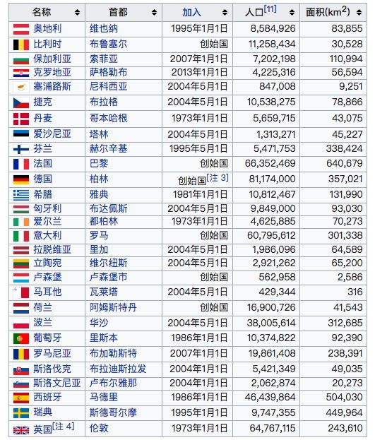 注意:英国于 2016 年经公投决定退出,并于 2017 年 3 月 29 日启动脱欧程序,但 2019 年 3 月 29 日前仍属成员国之一。