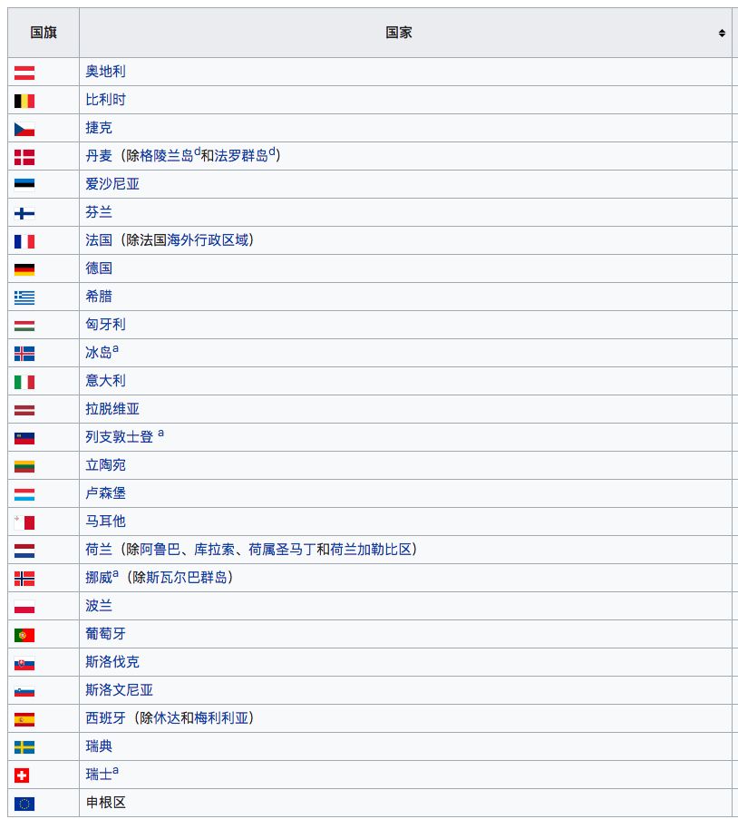 奥地利、比利时、丹麦、芬兰、法国、德国、冰岛、意大利、希腊、卢森堡、荷兰、挪威、葡萄牙、西班牙、瑞典、匈牙利、捷克、斯洛伐克、斯洛文尼亚、波兰、爱沙尼亚、拉脱维亚、立陶宛、马耳他、瑞士、列支敦士登。